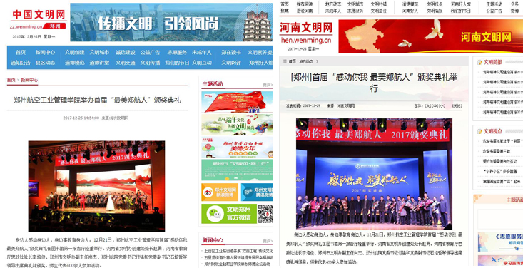 12月22日,中华网、凤凰网、香港中原网分别以 “他们用自己的行动感动你我 看郑州航院的最美航院人都长啥样?”、“他们用行动诠释‘最美’ 这十位郑航人感动你我”、“楷模引领校园风尚 郑州航院举行‘最美郑航人’颁奖典礼”为题聚焦报道我校开展的“感动你我 最美郑航人”评选表彰活动。