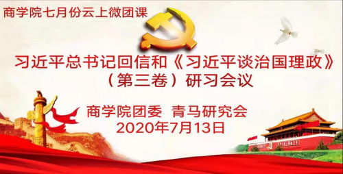 为进一步推动深入学习习近平新时代中国特色社会主义思想,贯彻落实学习宣传《习近平谈治国理政》第三卷工作,引导青年树立为共产主义远大理想和中国特色社会主义共同理想而奋斗的信念和信心,郑州航院青年马克思主义者学习研究会(以下简称“青马研究会”)联合商学院团委于7月13日晚通过钉钉视频会议的形式,共同发起本学期第三次“云上微团课”——学习习近平总书记回信和《习近平谈治国理政》第三卷研习活动。商学院分团委、学院辅导员老师以及“青马研究会”、学生会、青年志愿者团和艺术团等部门的学生骨干近70人参加了本次学习。