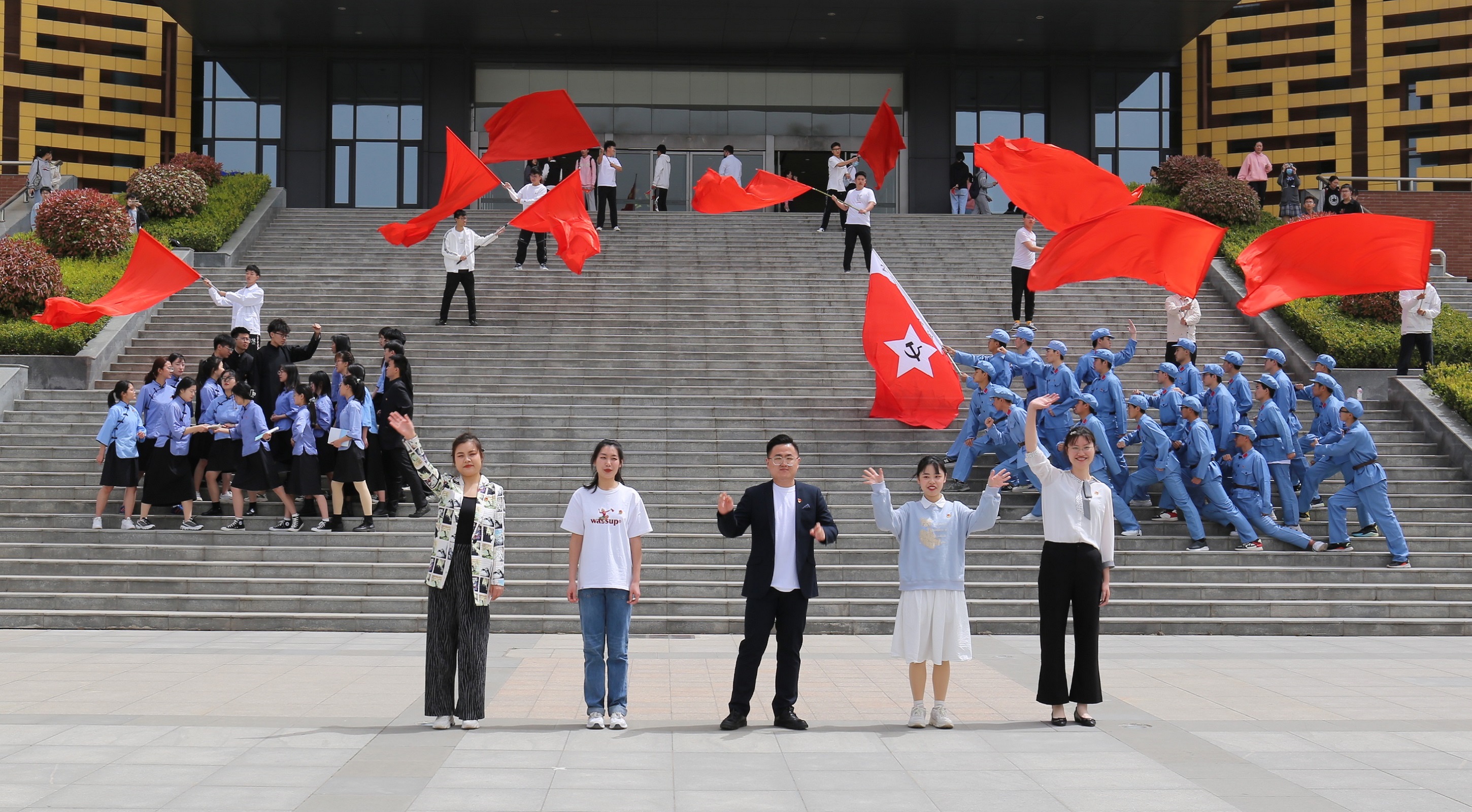 本次活动以“传承百年红色梦 不负青春追梦人”为主题,现场200名师生手持红旗,激情合唱建党百年主题曲《少年》。活动现场,随着歌曲《少年》的音乐奏响,4个情景方阵的参演人员激情演绎不同历史时期的青年师生。音乐进行到高潮阶段,10面红旗在图书馆阶梯最高处徐徐展开,随风飘扬,现场氛围被推向顶点。