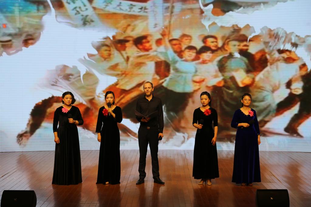 决赛现场,我校选送的《国际歌 中国梦》通过深切回顾近代中国积贫积弱时局下各阶层仁人志士奋起抗争,最终在中国共产党领导下实现“站起来”“富起来”“强起来”的奋斗历程,深情颂扬了无产阶级大团结大联合的精神。朗诵或婉约动人、或慷慨激昂,并呈现出中外教师同台、汉语法文穿插、朗诵歌唱结合等特色,充分展现了新时代我校统战成员勇担使命致力于专业建设和学校发展的进取精神,以及我校服务区域社会经济发展的责任和担当。