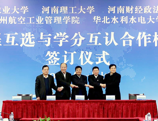 2019年1月7日,我校与华北水利水电大学、河南财经政法大学、河南农业大学、河南理工大学联合签署“课程互选与学分互认”合作框架协议,这一协议的签署标志着我省高校首次在校际之间打通资源平台、探索优质课程共享途径。