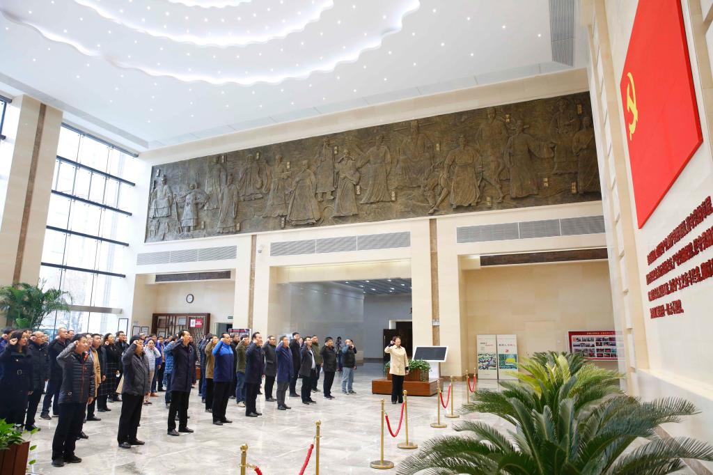 走进展馆大厅,熠熠生辉的党旗映入眼帘。在入党誓词展示墙前,全体党员庄严肃立,面对党旗,攥起右拳,重温入党誓词。