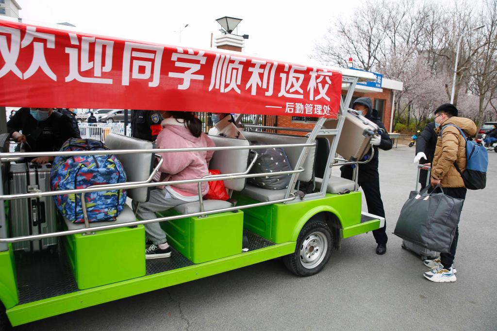 校园内,挂着“欢迎同学们顺利返校”红色条幅的电瓶车,不断往返于校门和学生宿舍之间。据工作人员介绍,为迎接学生返校,后勤管理处特地准备了电瓶车,帮助学生搬运行李。