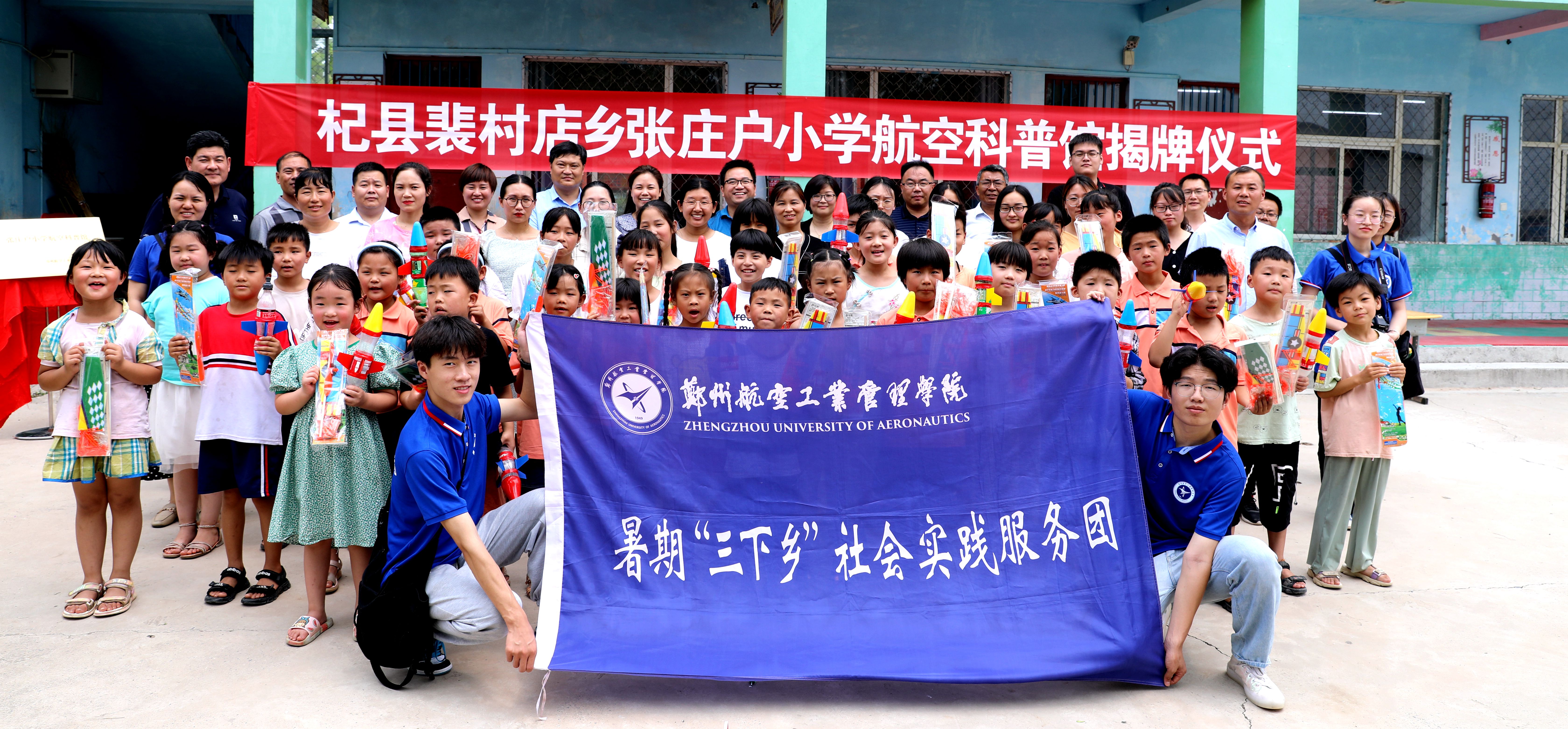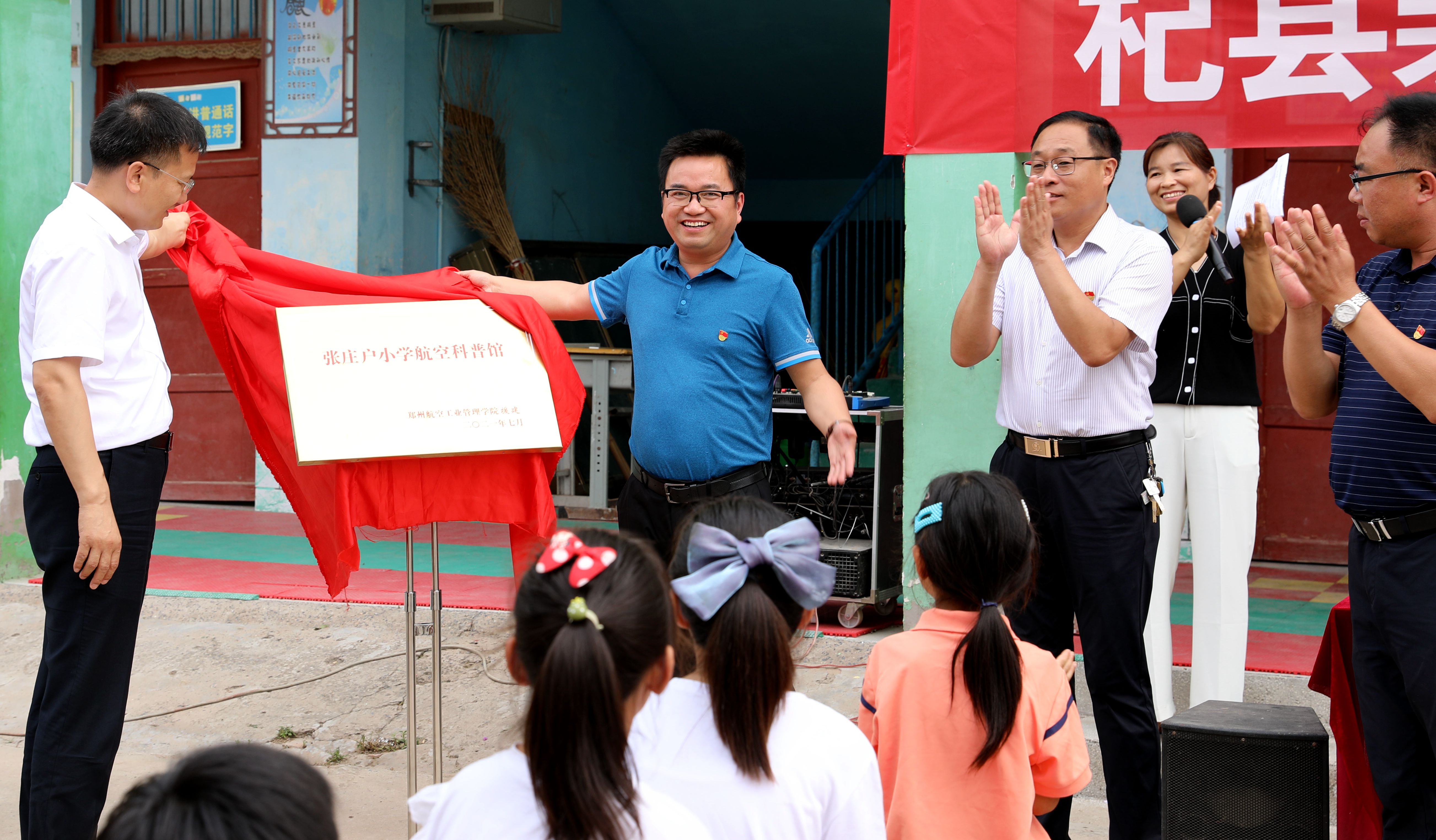 7月2日,由我校援建的航空科普馆在杞县裴村店张庄户小学揭牌开馆。校友联络发展处处长李胜伟和杞县县委常委、宣传部部长关亮为航空科普馆揭牌,校党委宣传部、航空工程学院、航空科普师生志愿服务队10余人及张庄户小学师生代表80余人参加了揭牌仪式。
