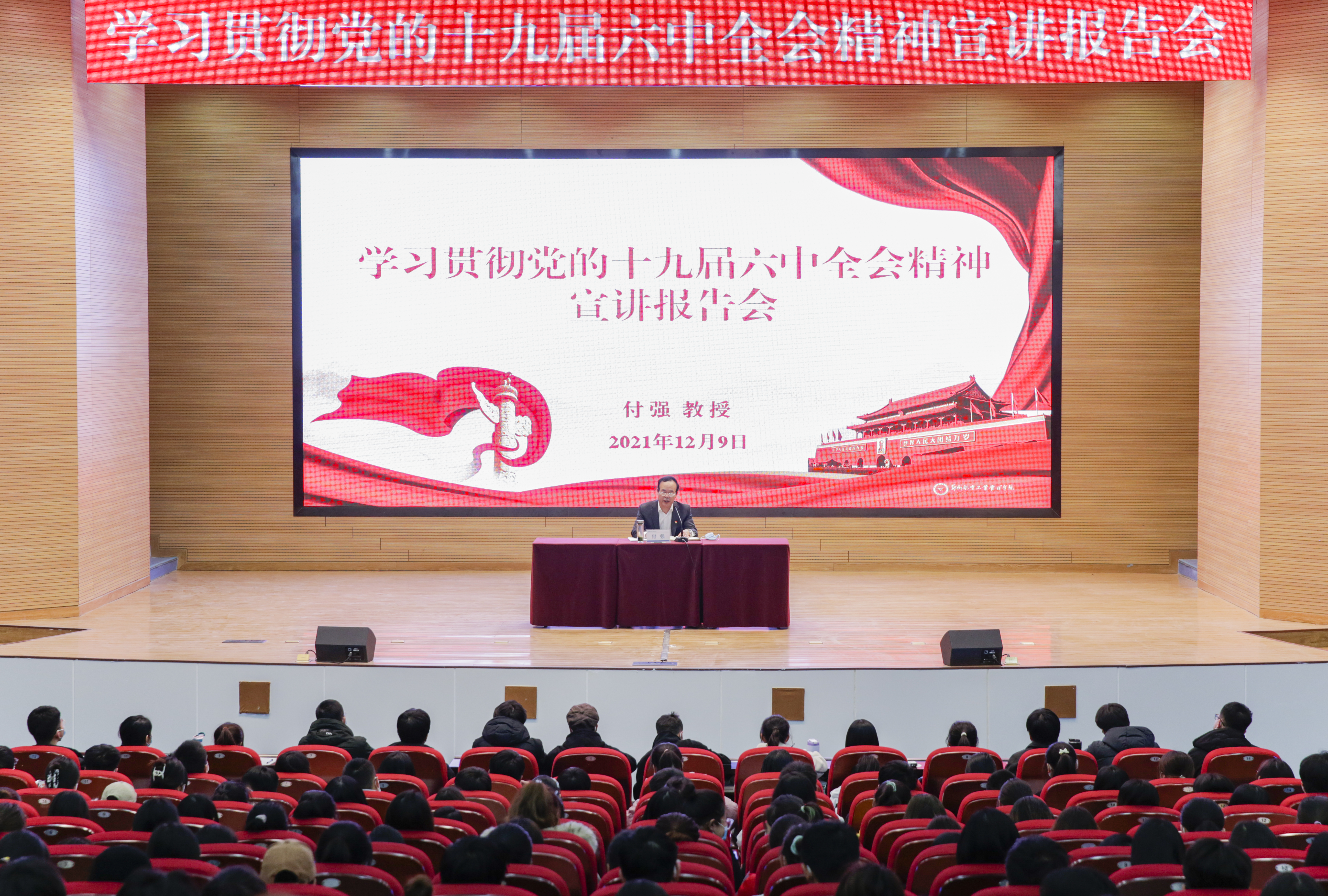 付强简要介绍了党的十九届六中全会召开的情况,深刻阐明了召开全会、作出决议的重大意义,阐释了党的百年奋斗的初心使命和重大成就,重点讲解了中国特色社会主义新时代的历史性成就和历史性变革,阐述了党的百年奋斗的历史意义和历史经验,对党的百年历史决议提出的重要思想和重要论断,特别是“两个确立”对新时代党和国家事业发展、对推进中华民族伟大复兴历史进程的决定性意义,结合学校当前和今后一个时期的改革和发展谈了认识体会。