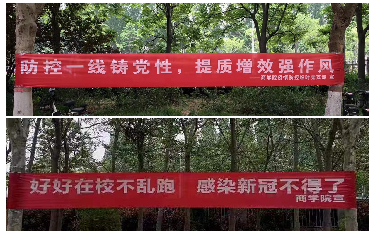 “好好在校不乱跑,感染新冠不得了”“防控一线铸党性,提质增效强作风”在校内围墙卡点处,商学院制作和悬挂的条幅格外醒目,提醒着在校青年大学生严格遵守学校疫情防控相关规定。