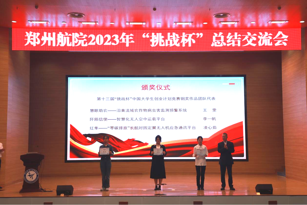 杨培、程骄杰分别为第十三届“挑战杯”国赛获奖团队和第二十届“郑航挑战杯”获奖单位颁发证书和奖杯。