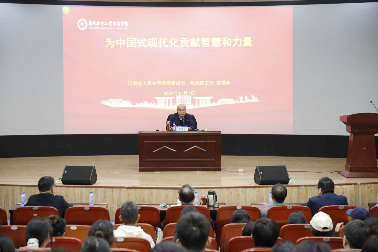 我校邀请省人民检察院政治部主任姚福安来校讲座 时间:2024年11月11日 作者:文法学院 文 新闻中心 图 编辑:新闻中心 邓彦雯 点击: 近日,我校特邀河南省人民检察院党组成员、政治部主任姚福安来校作题为“为中国式现代化贡献智慧和力量”的专题讲座。校纪委书记、监察专员王继锋出席讲座。 姚福安从“中国式现代化的艰苦探索、中国式现代化的历史必然性、为中国式现代化贡献智慧和力量”三个方面分享了他的思考和研究。他指出,百年未有之大变局是中国共产党立足中华民族伟大复兴战略全局,科学认识全球发展大势、深刻洞察世界变化作出的重大判断,要在中外文化的对比中准确把握中国式现代化的科学内涵,增强历史自觉,坚定文化自信,勇担时代使命,切实为中国式现代化贡献智慧和力量。讲座主题鲜明、案例生动,对广大师生学习中华优秀传统文化,理解中国式现代化的理论逻辑、历史逻辑和实践逻辑具有指导意义。 此次讲座由党委宣传部主办,经济学院和文法学院联合承办。全校师生代表参加。 2024年11月11日 校内新闻 上一条:我校参与承办第二届国际绿色航空发展大会“气动设计与优化”分论坛 下一条:我校两名教师入选河南省高等学校教学名师 【关闭】