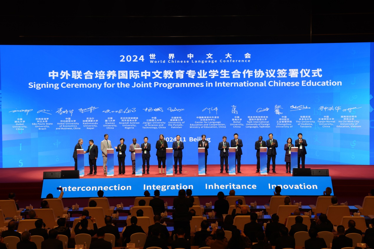 11月15日,以“联通融合,传承创新”为主题的2024世界中文大会在北京国家会议中心隆重开幕。国家主席习近平向2024世界中文大会致贺信并祝贺孔子学院成立20周年,国家副主席韩正出席大会开幕式并致辞,教育部部长、中国科学院院士怀进鹏主持会议。应教育部中外语言交流合作中心和中国国际中文教育基金会邀请,副校长张聚伟参加大会开幕式及全体会议。