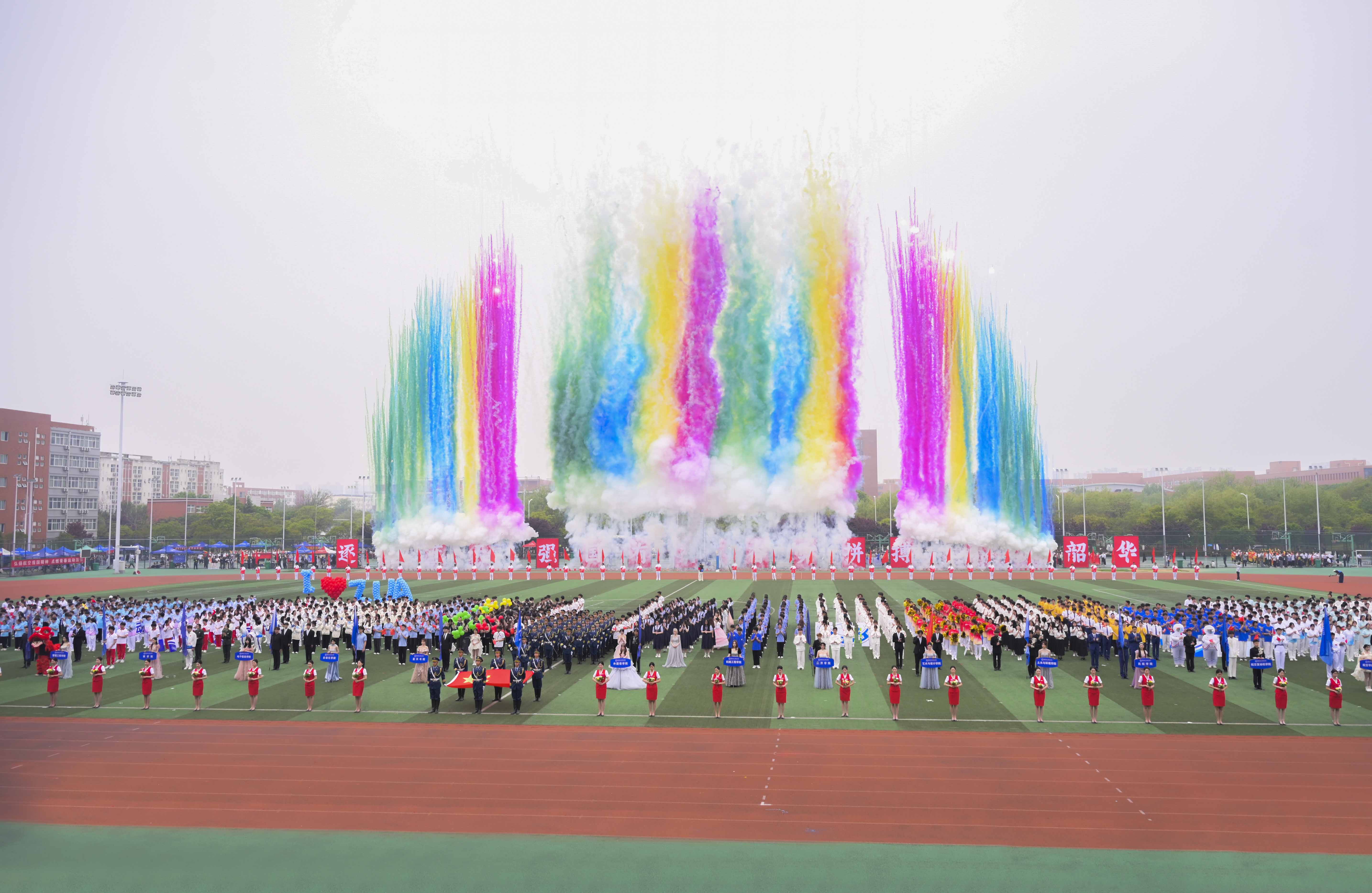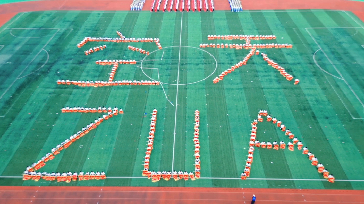 节目展示环节,航模表演率先登场,河南省重竞技航空运动中心航空模型项目团队先后带来线操纵特技飞行、固定翼四机空战、手操遥控滑翔机飞行、直升机遥控花式特技飞行等表演,航模腾空而起,在体育场上空盘旋、俯冲、翻转、追逐,一组组高难度操作干净利落,惊艳全场。多旋翼无人机将“运动激扬青春,奋斗成就梦想”的条幅高高悬起,随风展开,在蓝天映衬下格外醒目。千余名手持彩旗的同学随即奔向操场中央,彩旗翻飞,队列变化,定格为“空天ZUA”字样与一架蓄势起飞的飞机造型。随着场上曲风转换,华尔兹集体舞蹈登场,红裙飞扬,舞步轻盈,为赛场添了几分柔美。压轴的是舞扇团体表演,300名学生挥动蓝色舞扇,扇面开合,层层铺展,如云海翻涌,喝彩声与鼓点声交织,看台上掌声与呐喊声久久不息。