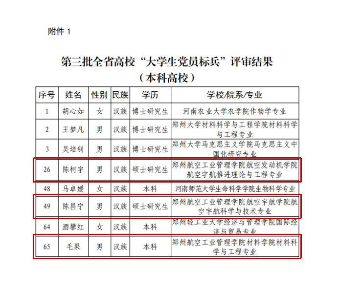我校三名学子在全省高校“大学生党员标兵” 选树中脱颖而出、成功入选,他们在学业科研中深耕笃行、在服务奉献中践行初心、在实践创新中勇毅争先,充分彰显了新时代郑航青年党员的先锋本色,更是学校落实立德树人根本任务、以高质量党建引领育人实效的生动写照。希望全体郑航学子以榜样为镜、向标杆看齐,坚定理想信念、锤炼过硬本领,在青春赛道上奋力奔跑,以青春担当助力学校高质量发展,为国家航空航天事业贡献青春力量!