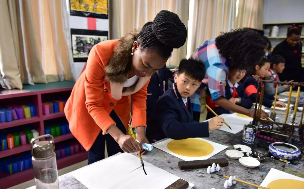 在教学观摩中,他们积极参与到课堂之中,遇到感兴趣的内容时会跟学生交流,互动,还有些人拿起毛笔,体验书法和国画。