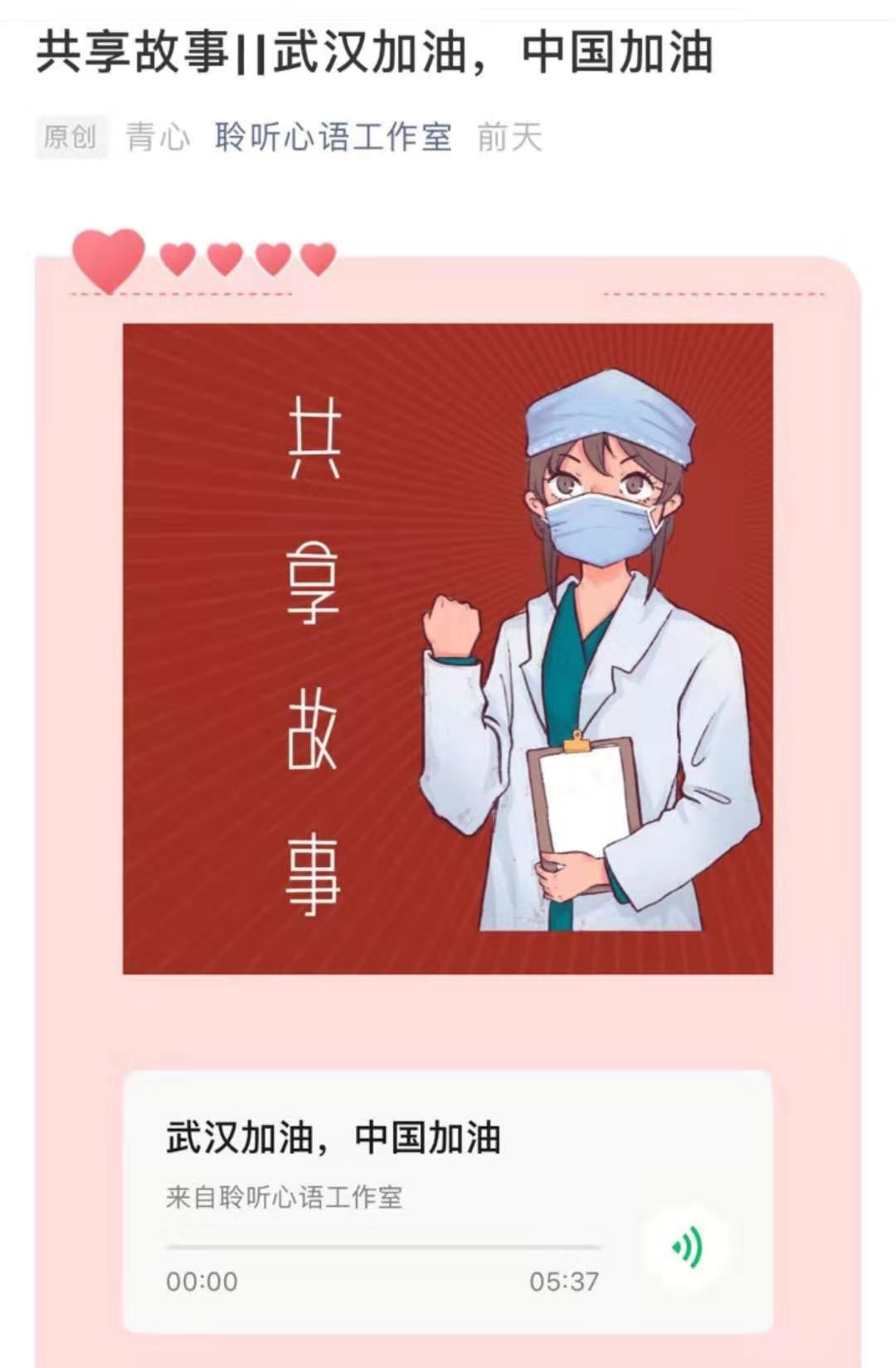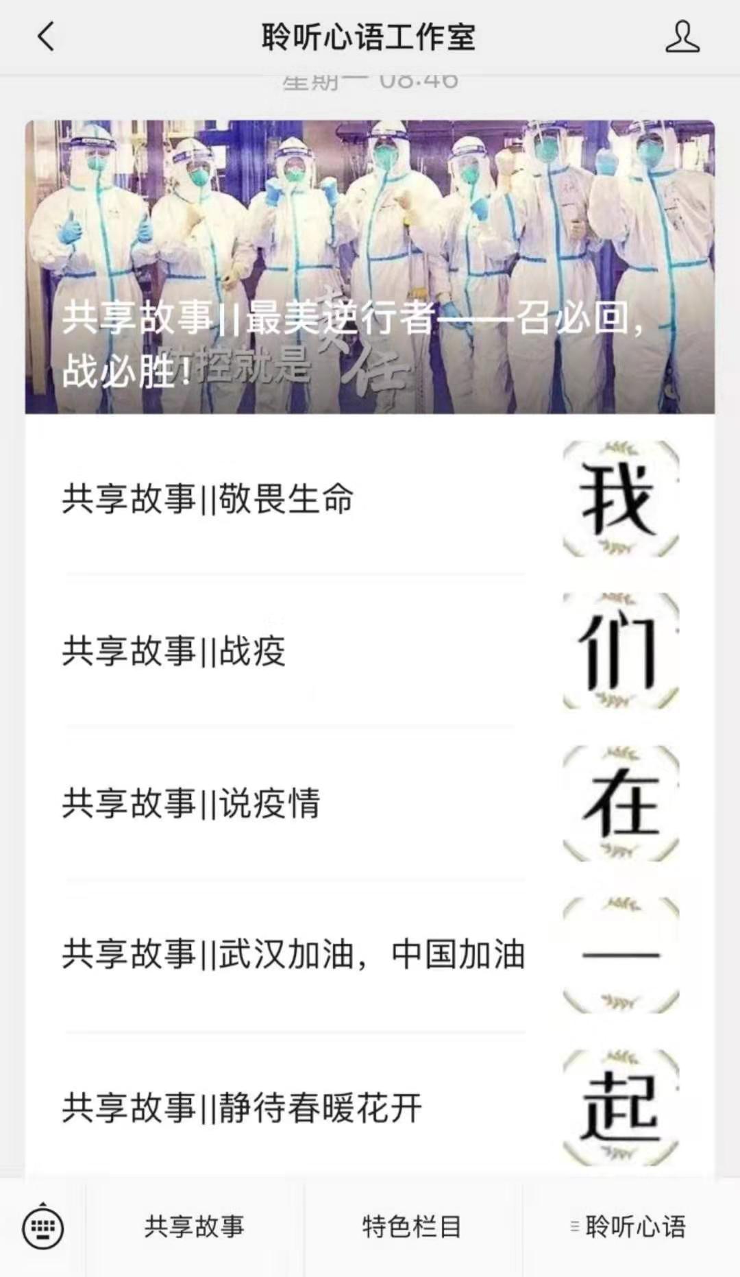 正是出于这样的初衷,聆听心语工作室除了及时推送抗击新型冠状病毒肺炎的典型事迹和感人故事外,也希望通过线上渠道疏导当前学生的不良情绪,引导他们持有战胜疫情所需要的理性、平和、积极、乐观的心态。