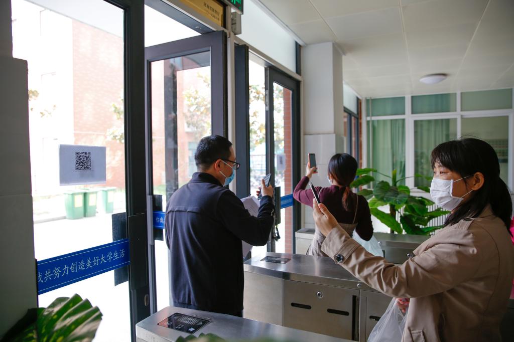 “报到日”的演练,实战模拟学生“返校报到进入校区”这一重要环节。学生佩戴口罩,严格遵守学校错峰错时要求,分批返回学校。在两个校区指定的入校校门,按照划分的不同通道,保持1米的间距,依次出示个人“健康码”,验证合格后进入“体温检测区”进行体温检测,正常者按指定通道有序步行入校。
