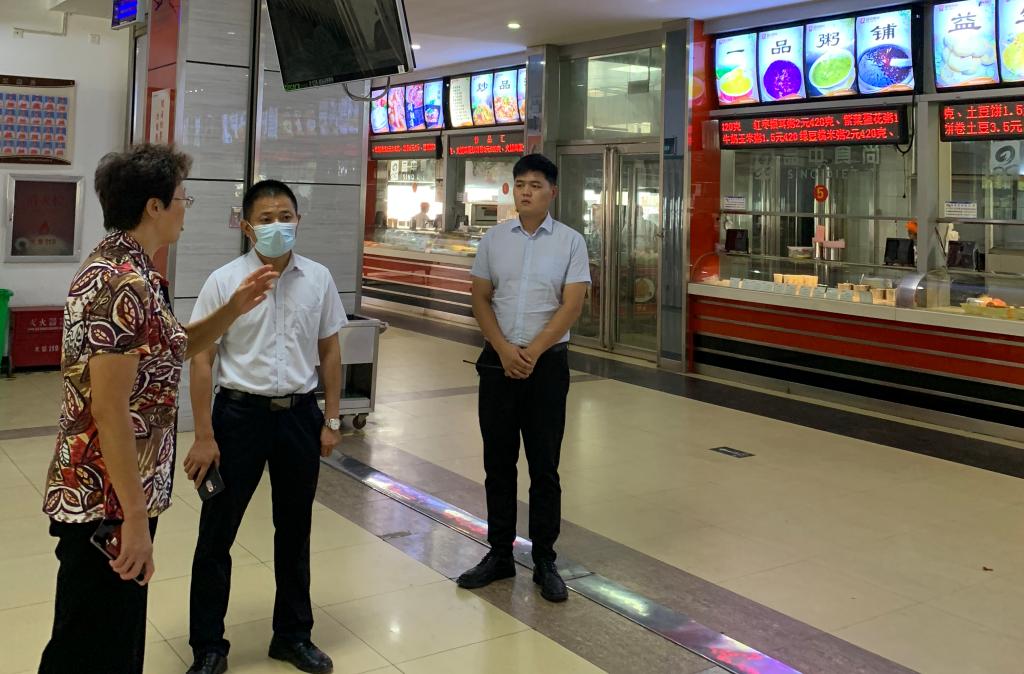 张文强实地查看了食堂“节约粮食、反对浪费”宣传展板和标语、饭菜销售、师生用餐、餐厅收残等情况,听取了后勤管理处工作人员的相关汇报。