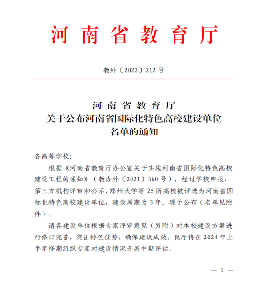 近日,河南省教育厅下发《关于公布河南省国际化特色高校建设单位名单的通知》(教外〔2022〕212 号),经学校申报、第三方机构评审,我校入选河南省国际化特色高校建设单位。