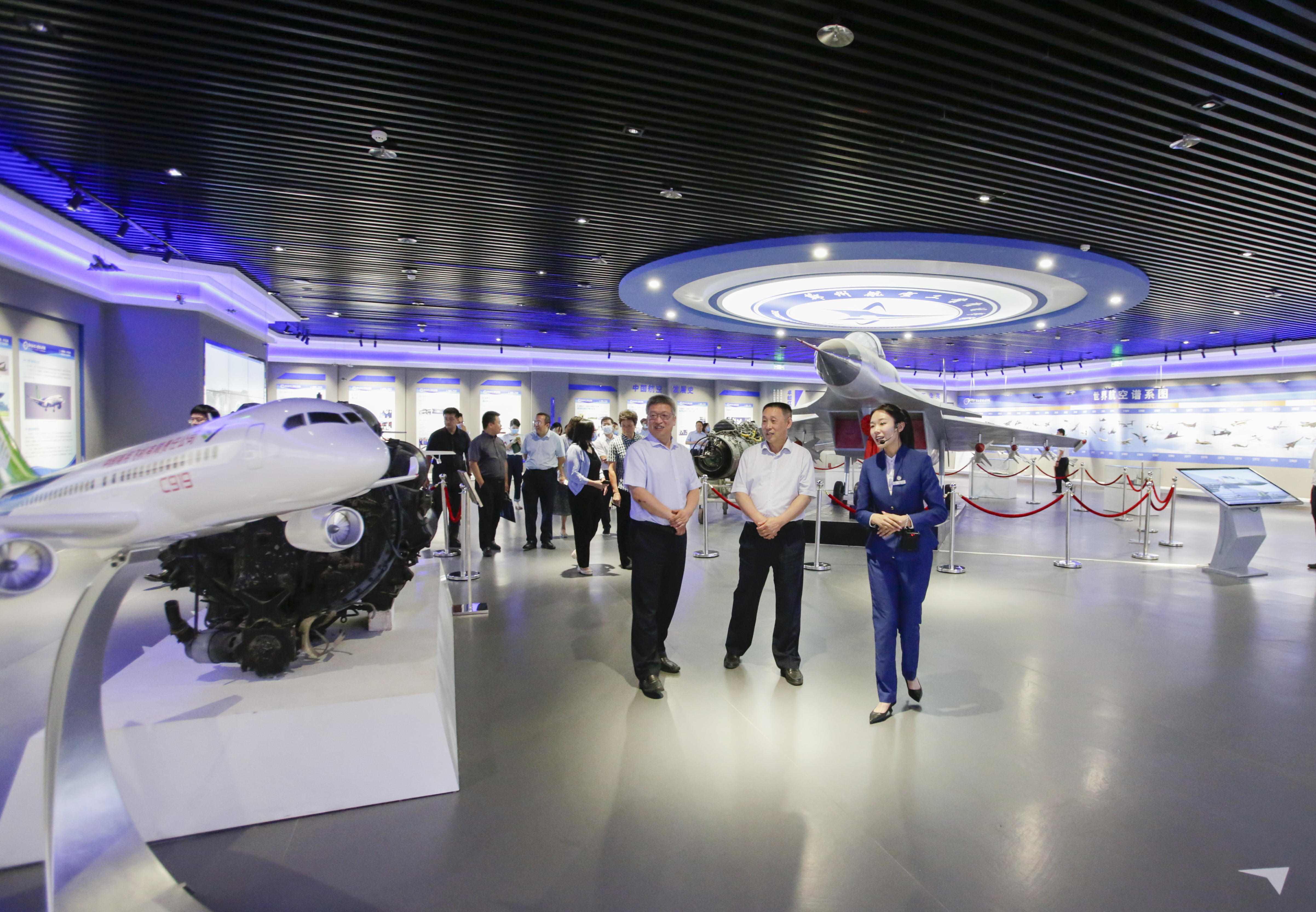 刘代军、费斌军、张文强等陪同刘建葆一行参观航空文化馆。