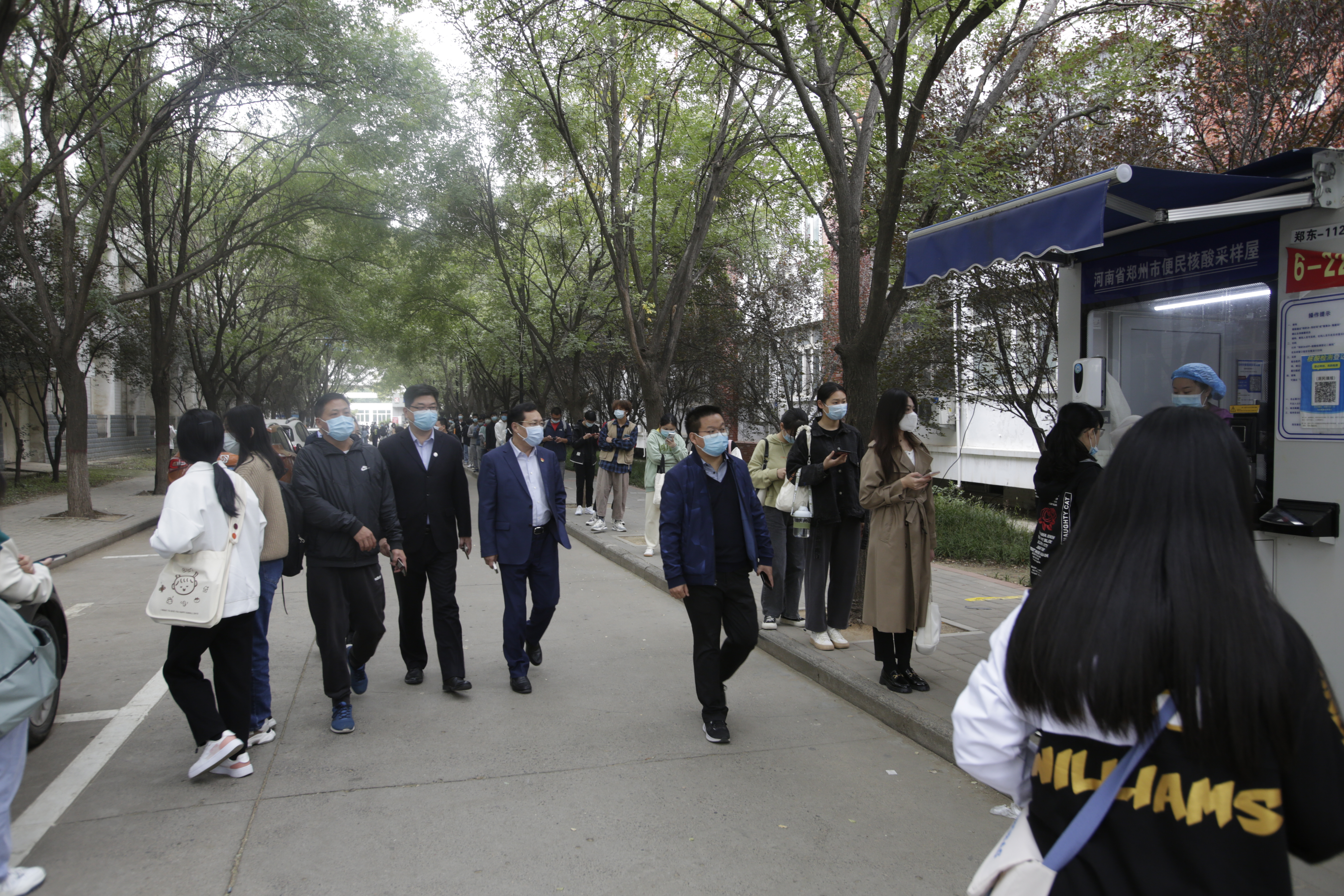 王继东先后来到龙子湖校区西大门、南大门、核酸检测采样点、丹尼斯超市、学生食堂等疫情防控重点区域,实地查看人员出入、车辆管控、信息登记、体温检测、防疫消杀、物资储备、后勤保障等情况,重点听取学生处、后勤管理处、保卫处负责人关于校园疫情防控和安全稳定防范措施落实情况。