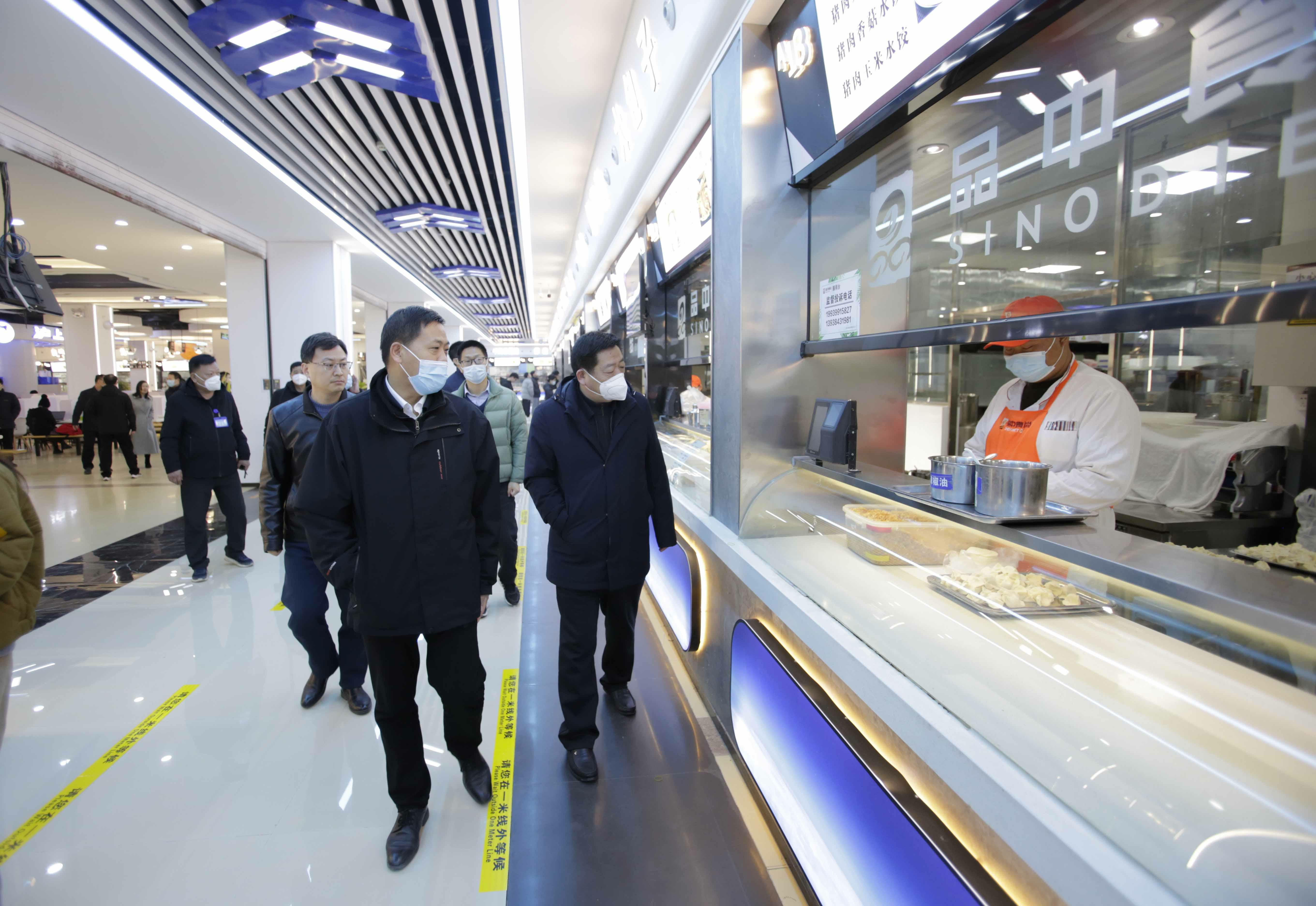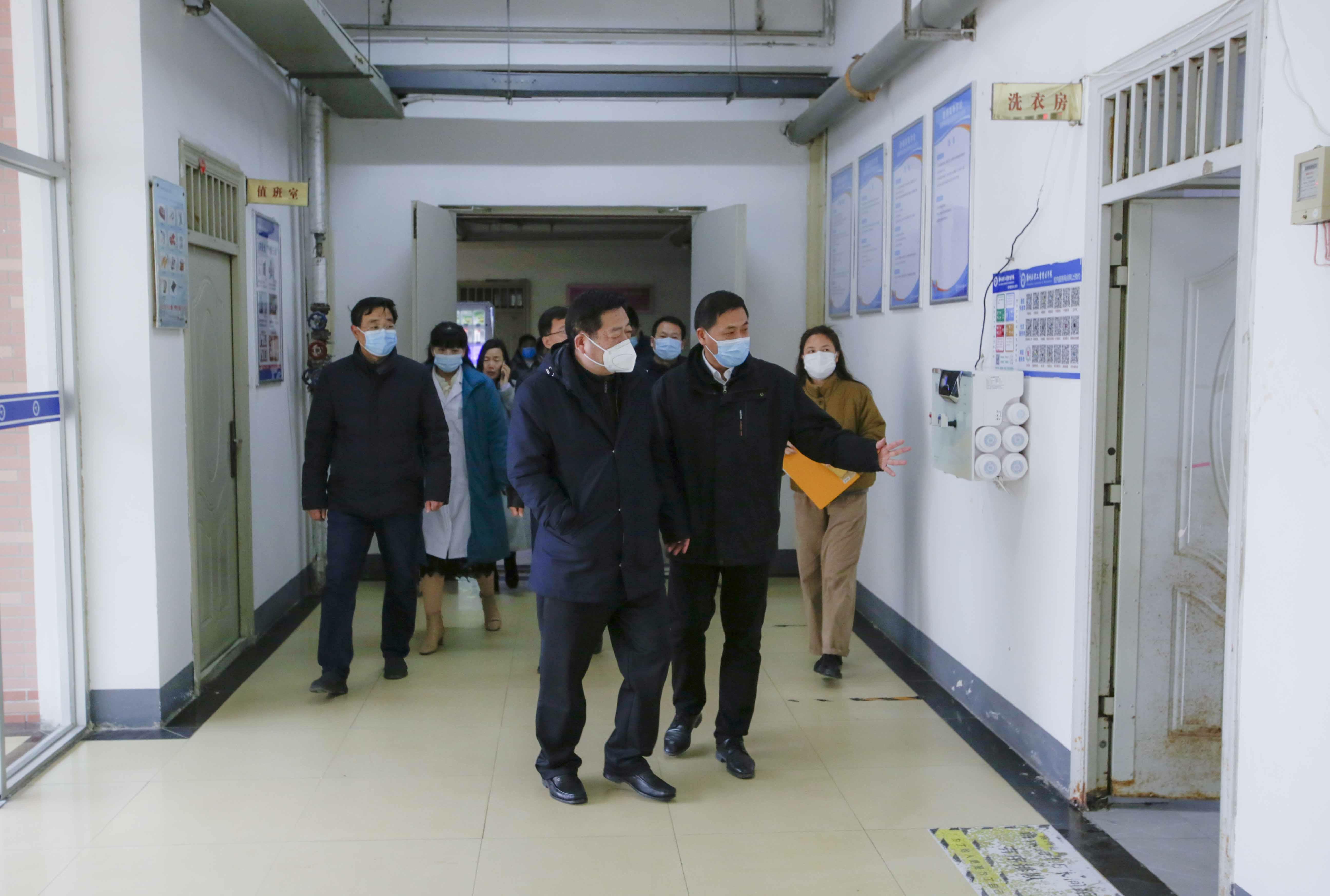 张水潮一行实地查看了防疫物资储备室、健康驿站、东苑餐厅、校医院等场所,仔细询问防疫药物储备、健康驿站建设、师生健康检测、重点区域清洁消杀、防疫知识普及、日常安全管理等情况。