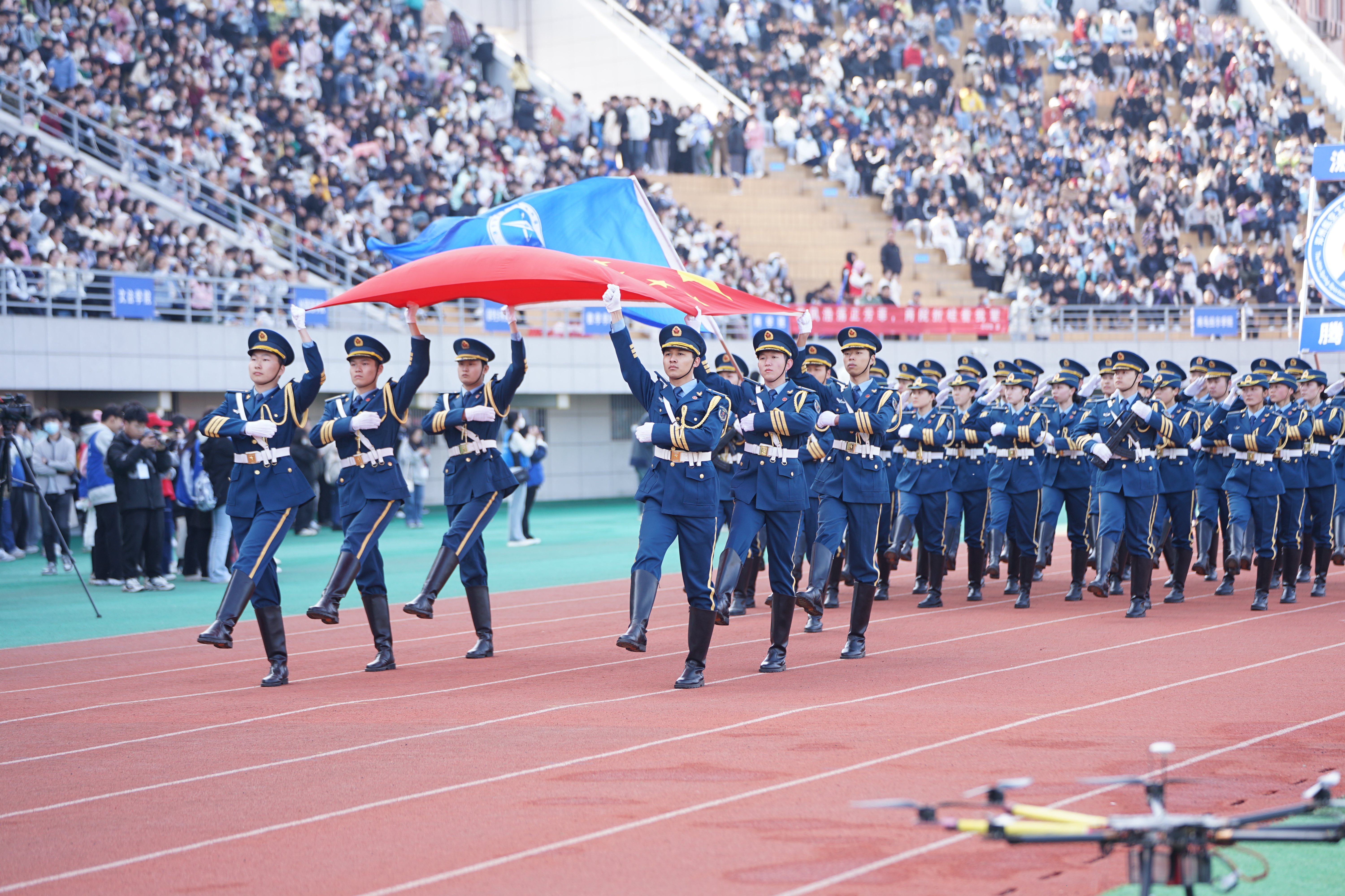 伴随着慷慨激昂的《运动员进行曲》,国旗护卫队迈着铿锵有力的步伐入场,飒爽英姿,昂首阔步,瞬间点燃现场师生们的热情和激情。网红萌宠扮装、创意手牌联动、巨型彩旗漫卷……各学院学生组成的方块队,将体育精神和学院特点巧妙结合,以朝气蓬勃、独具特色的创意表演展示异彩纷呈的方阵造型,展现郑航学子自强不息、奋发向上的精神风貌。