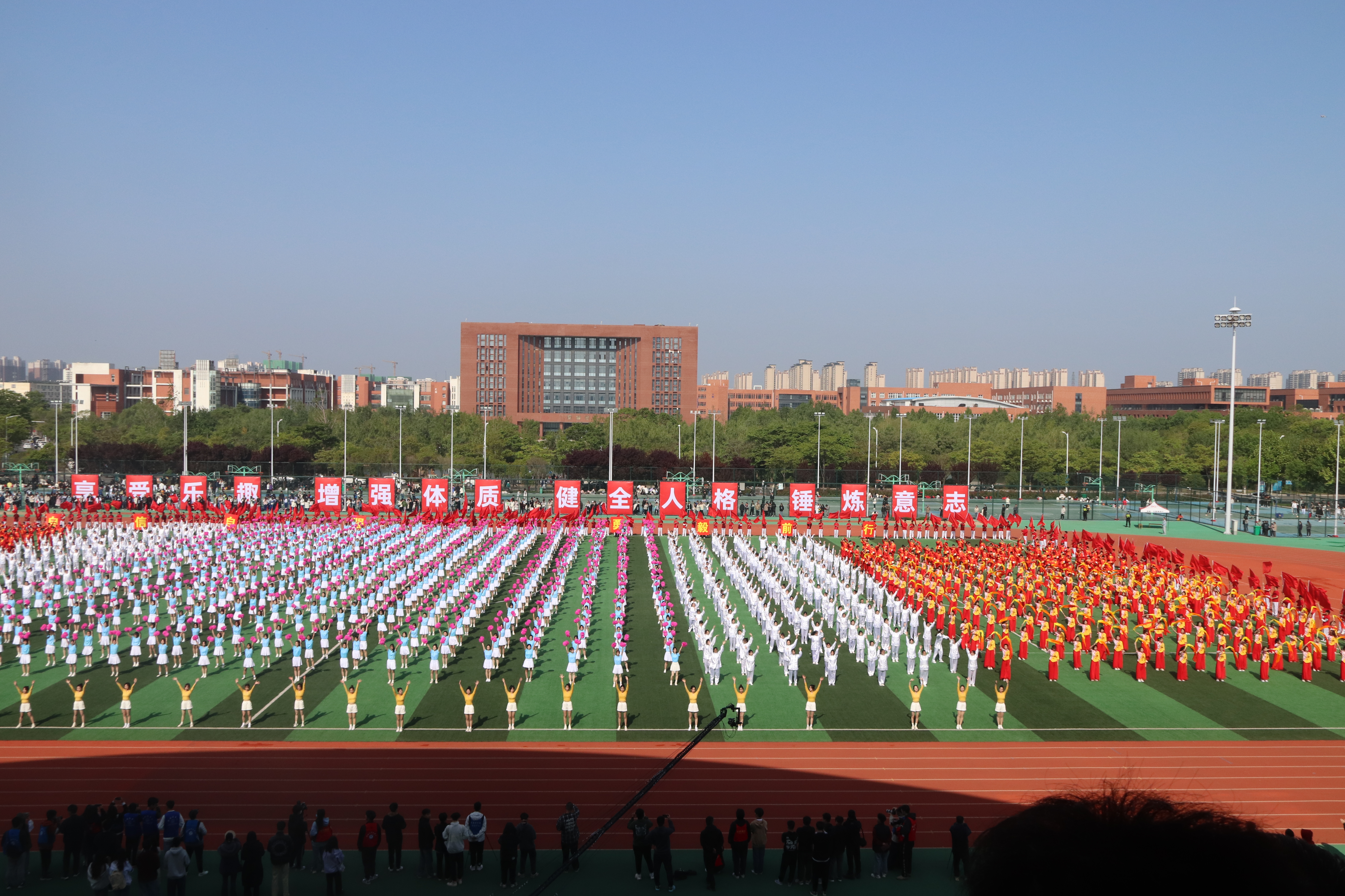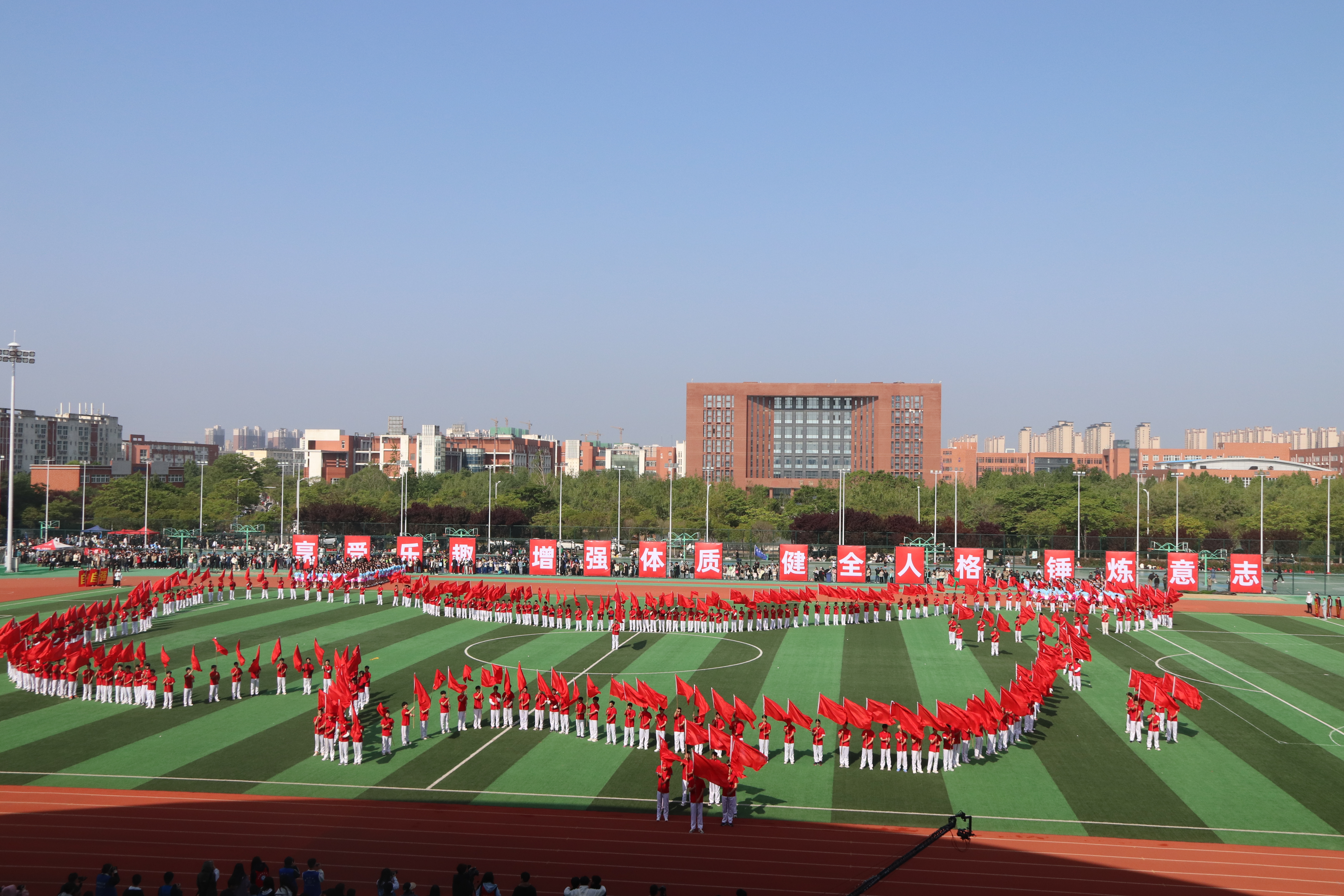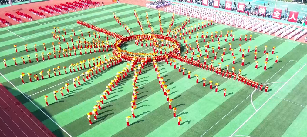 1700余名大学生参演了开幕式的重头戏——《一路开花》大型团体操表演。团体操表演兼顾传统与现代,融合腰鼓、长绸扇、红旗、健身气功、花样跳绳、啦啦操等特色元素,手持花束迎辉而立,肩扛旗帜乘风舞动,为大家带来了一场活力四射的视觉盛宴,其中红旗表演队用288面旗帜组成了一幅“中国地图”,展现郑航学子拳拳爱国之心。