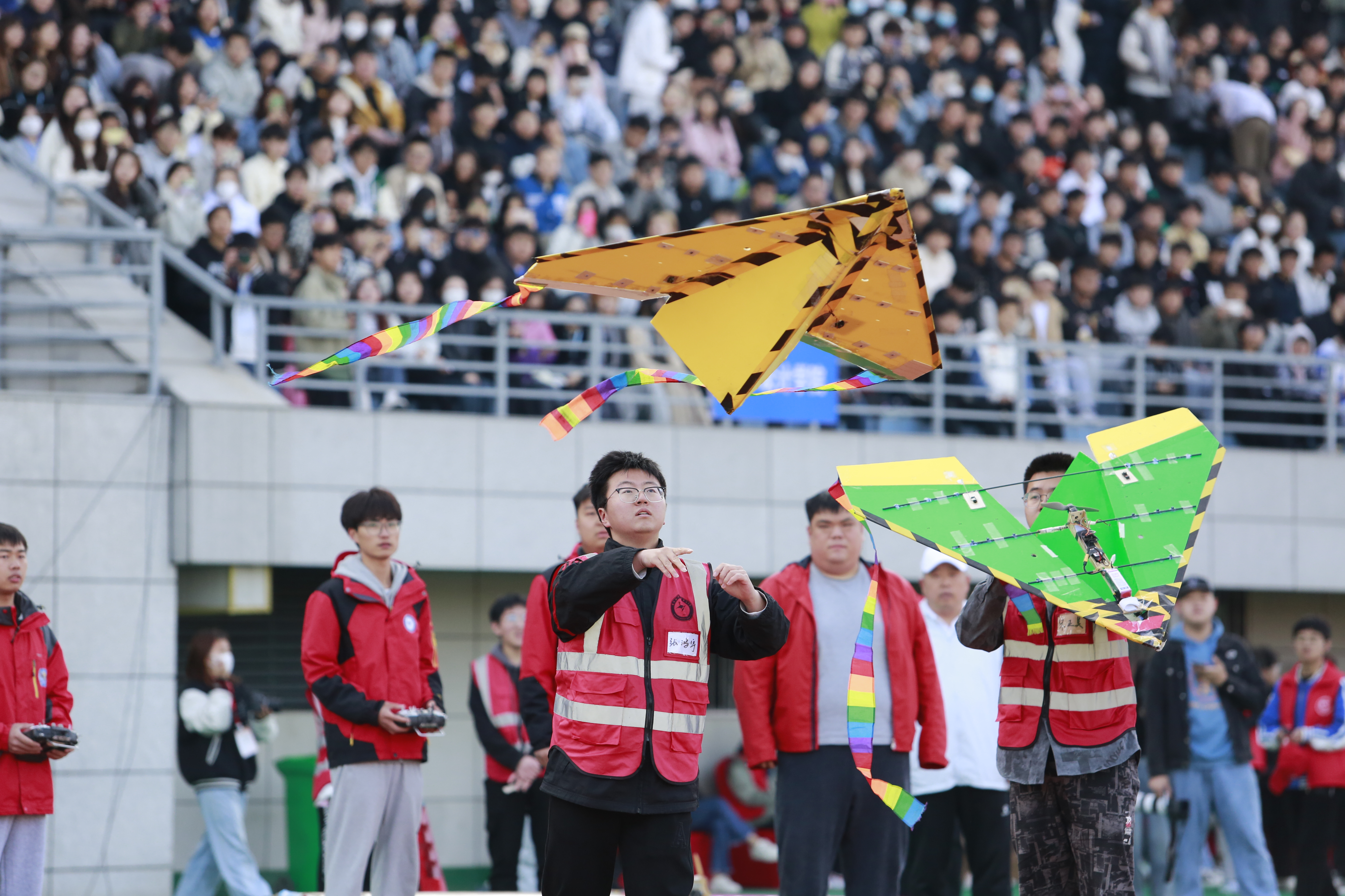 我校航模队为开幕式带来了精彩的“航模秀”。除了纸飞机编队飞行、歼-10花样飞行、遥控手掷滑翔机飞行等一系列炫酷表演以外,与往届不同的是,今年新增了限时载运空投飞机飞行表演,这架飞机模型又称“三公斤”,曾代表我校参加中国国际飞行器设计挑战赛并取得优异成绩。最值得一提的是,在遥控手掷滑翔机飞行表演中,飞手一场低开高走的表演惊艳四座。起势较低的航模被航模飞手投掷空中,接连3个360度飞旋,直冲百米高空,如雄鹰振翅震撼全场。在飞手的操控下,航模或在空中悬停,或与风竞逐,或接续翻转,点头致意,妙趣横生。