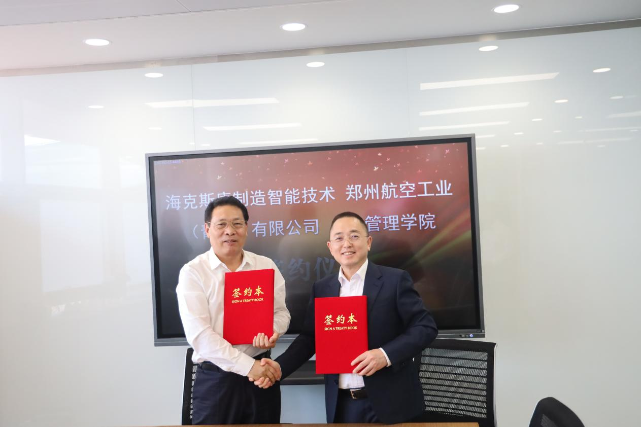 王继东和海克斯康测量系统大中华区执行总裁王德勇校企双方签订合作协议。