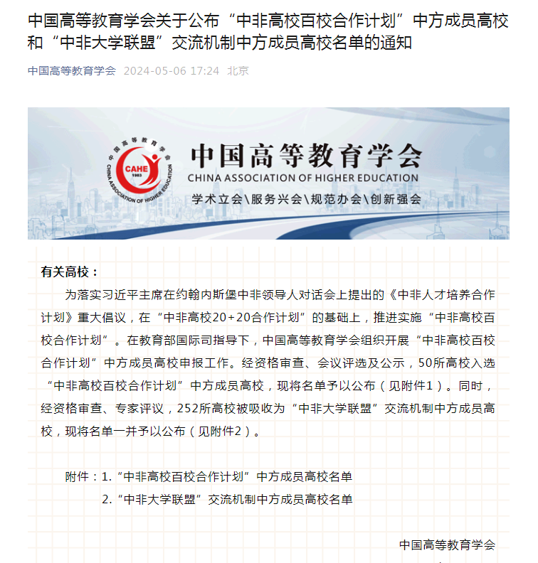 近日,中国高等教育学会发布《关于公布“中非高校百校合作计划”中方成员高校和“中非大学联盟”交流机制中方成员高校名单的通知》,我校在“语言文化与文明互鉴”领域入选“中非大学联盟”交流机制中方成员高校。