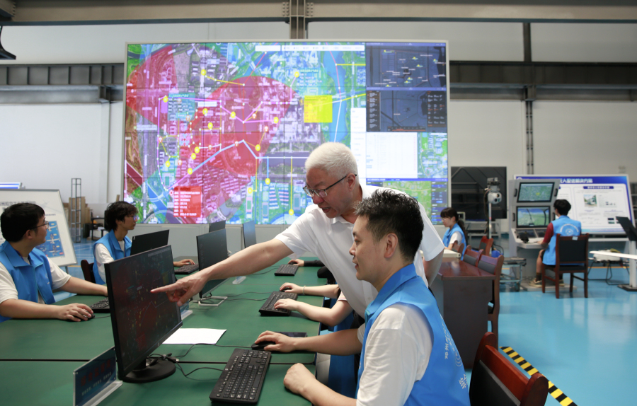 9月24日,郑州航空工业管理学院,郑州寄递物流与低空经济融合发展示范点,控制屏幕上闪烁着多个亮点,标注着无人机的实时位置,邓中亮正凝视着屏幕,指导工作人员修正参数。