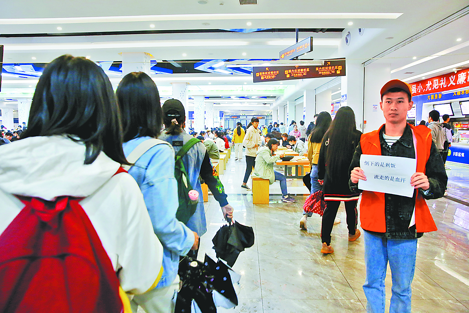 身穿志愿服,拿着宣传标语,智能工程学院2019级学生李佳洁积极参与了文明督察活动。她和其他督察员提醒学生们整齐摆放自行车以便节约空间;对于剩饭过多的人,她们会在食堂餐具回收处提醒他们注意节约。“通过这次活动,我真切地意识到我们在不知不觉中已经浪费了许多食物,以后在生活中我也会经常提醒身边的人珍惜食物。”李佳洁说。